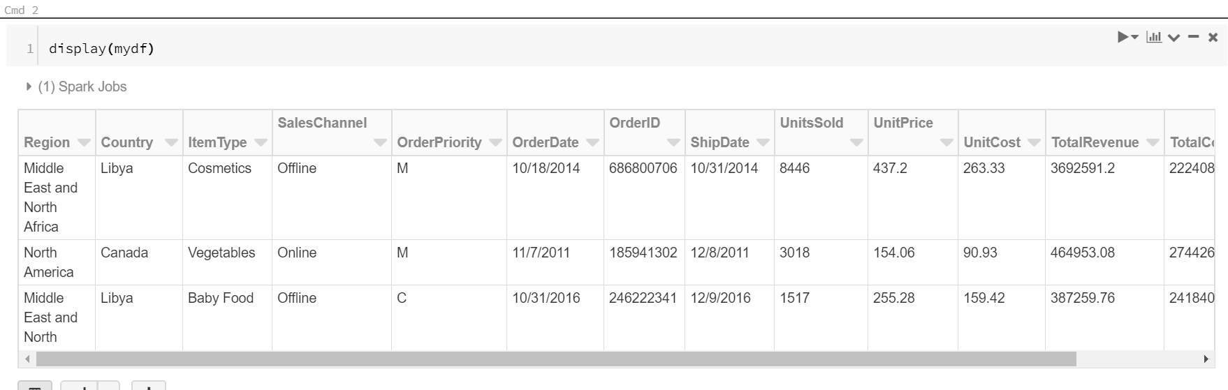 val mydf = spark.read.format("csv") .option("header","true") .option("inferSchema", "true") .load("/FileStore/tables/1000_Sales_Records-d540d.csv") |
