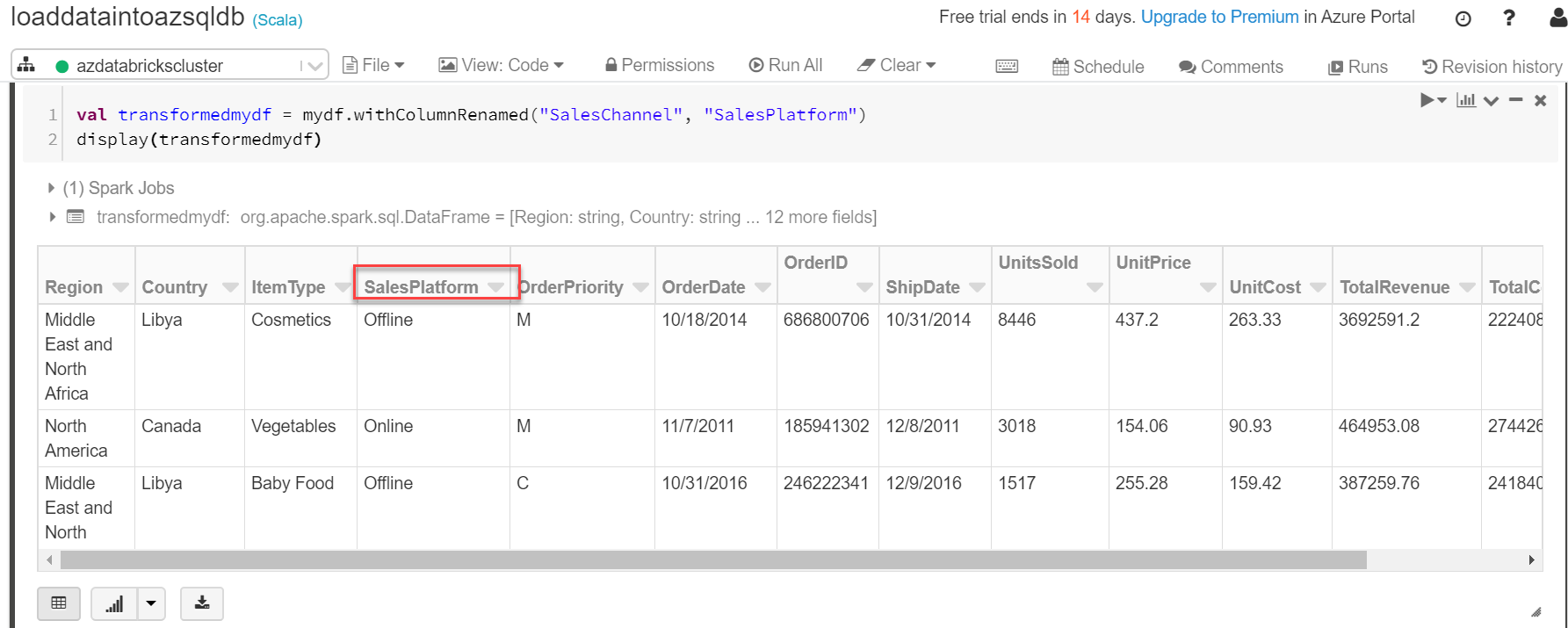 val transformedmydf = mydf.withColumnRenamed("SalesChannel", "SalesPlatform") display(transformedmydf) |