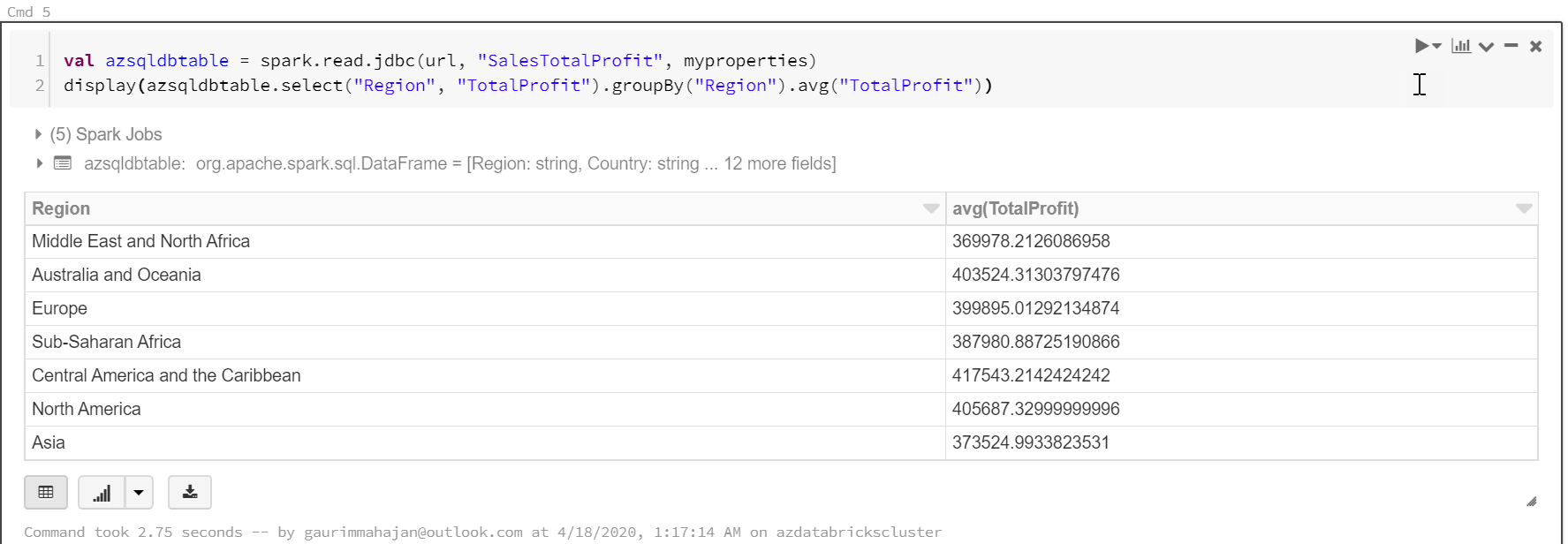 val azsqldbtable = spark.read.jdbc(url, "SalesTotalProfit", myproperties) display(azsqldbtable.select("Region", "TotalProfit").groupBy("Region").avg("TotalProfit") |